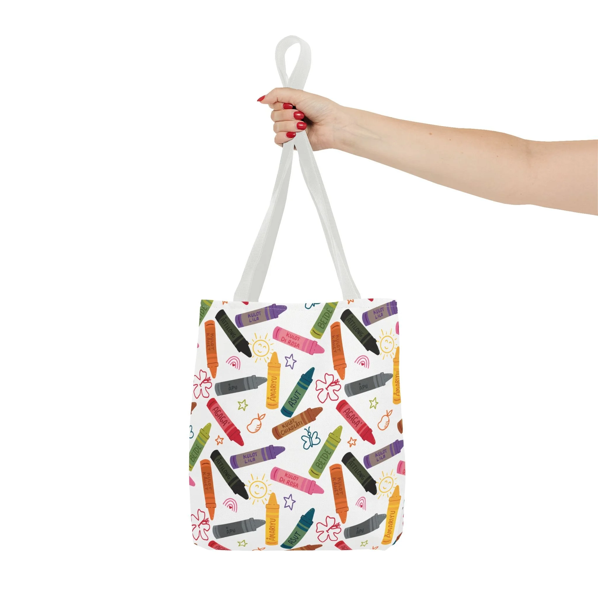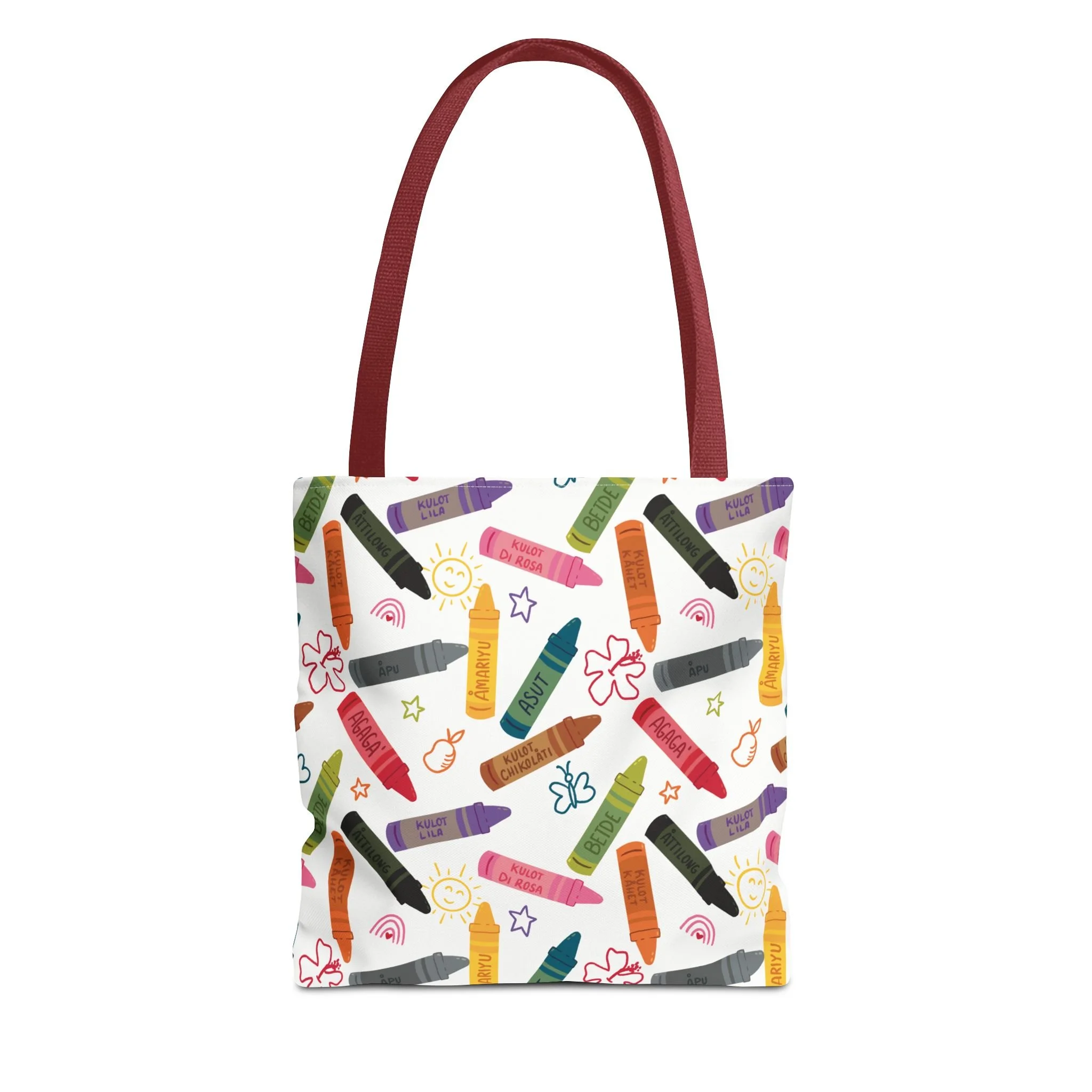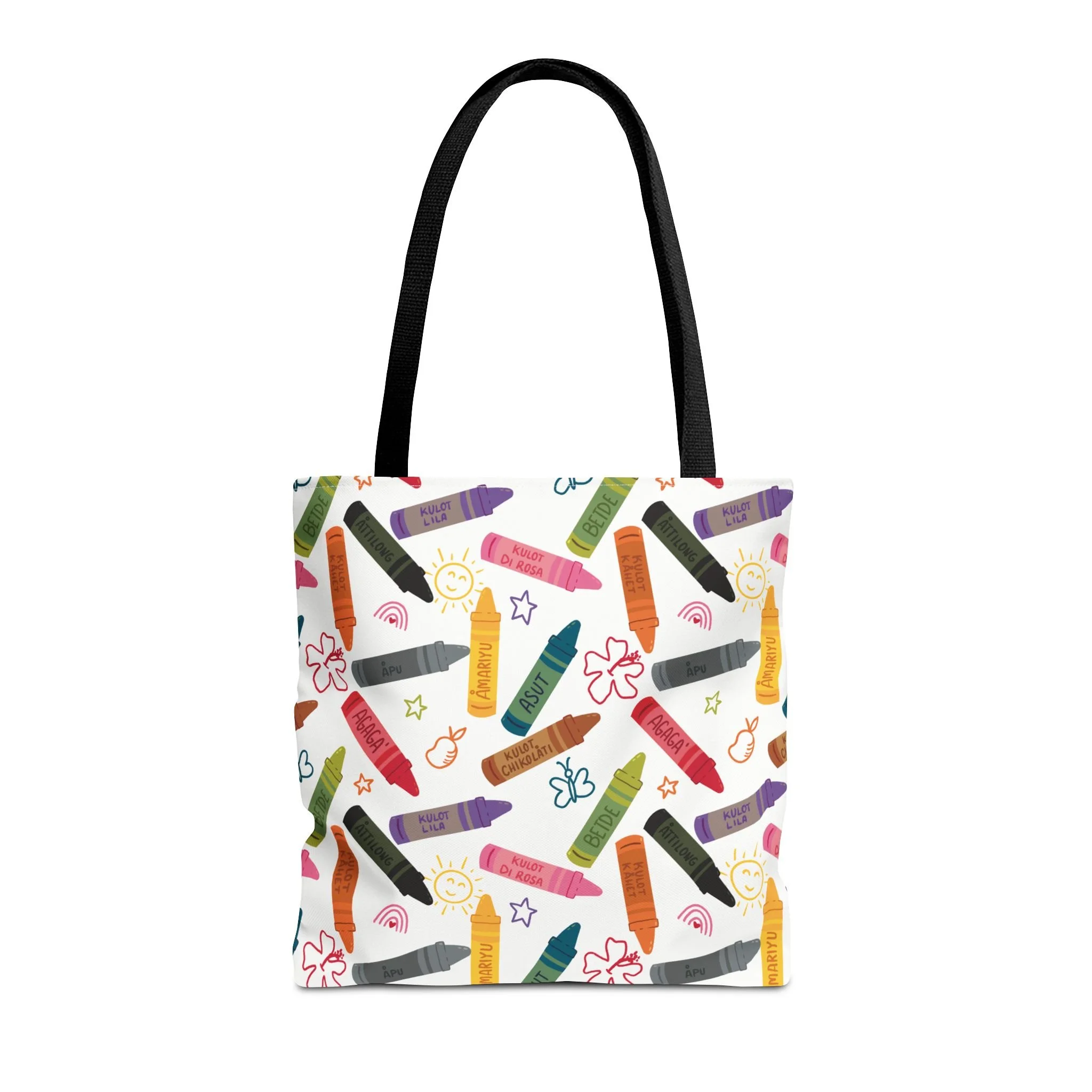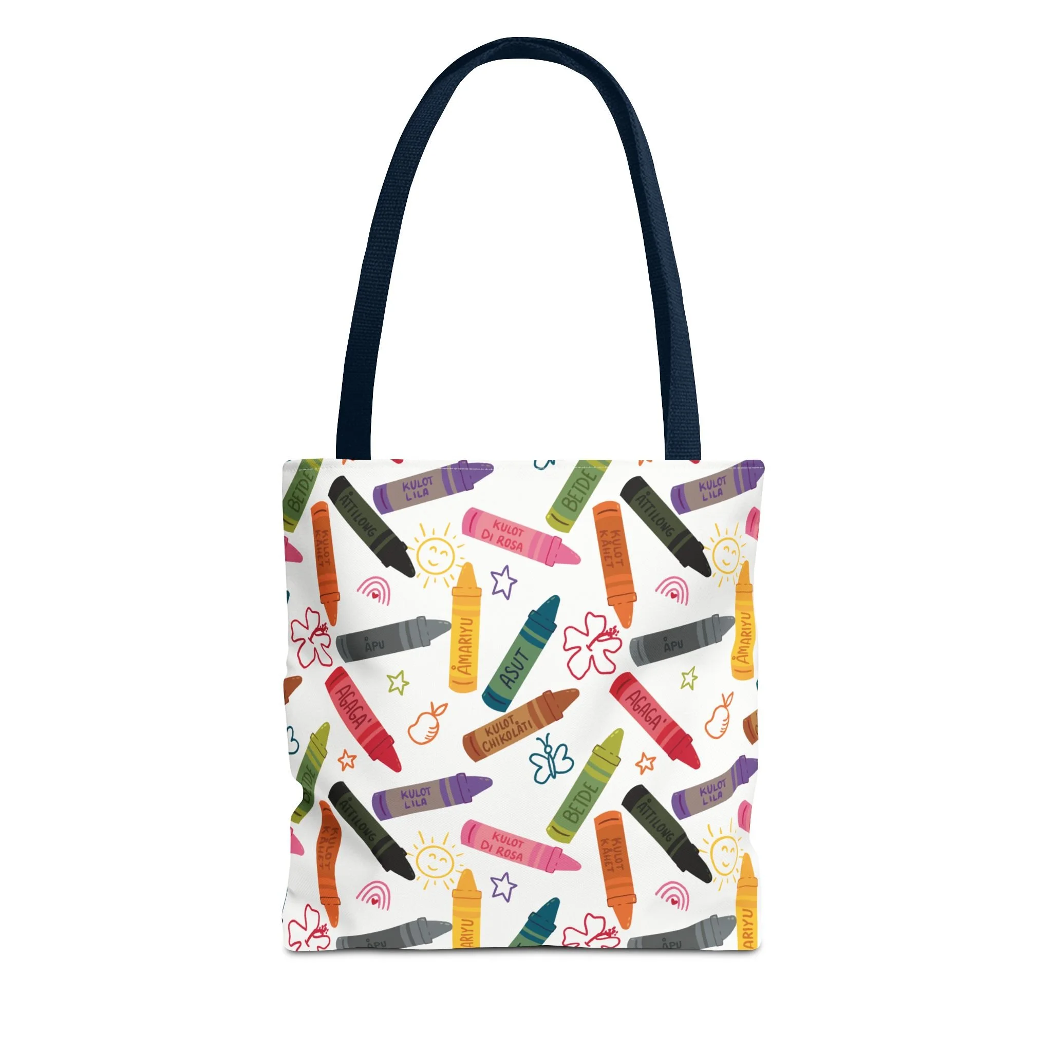 This vibrant Kulot Siha Chamoru color tote captures island pride and everyday utility in one durable bag. The colors and name celebrate Chamoru heritage while the roomy, boxed-corner shape carries groceries, market finds, beach towels, or a commuter’s essentials with ease. Reinforced handle stitching and a medium-weight polyester body stand up to daily use and quick drying after a day at the shore. Subtle, color-matched inner seams and a non-woven laminate interior give the tote a clean finish and structure without adding bulk. Choose from multiple handle colors and three sizes to suit market trips, classroom gear, or a relaxed weekend by the water—this tote keeps the feeling of place close at hand and makes daily errands feel a little more like coming home.