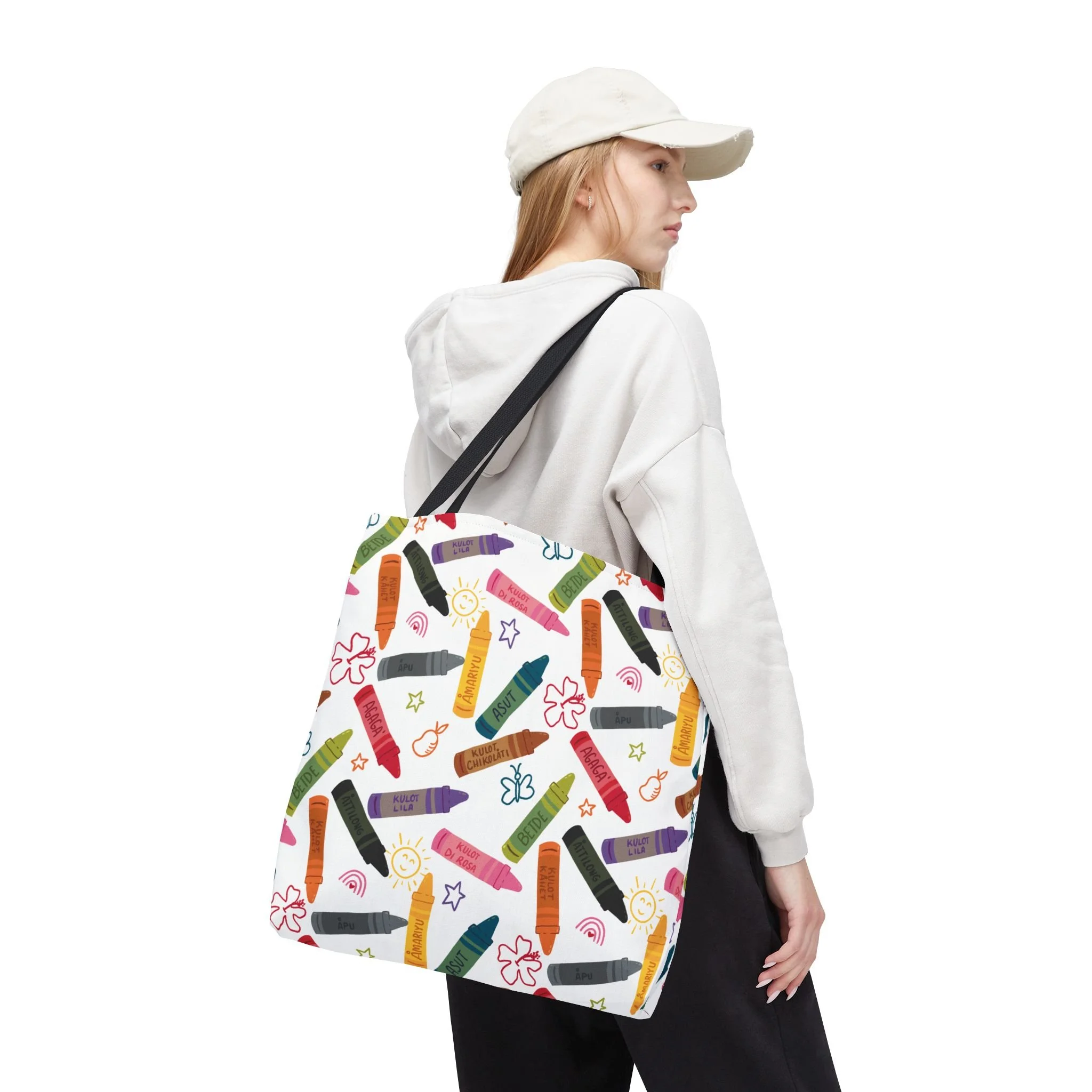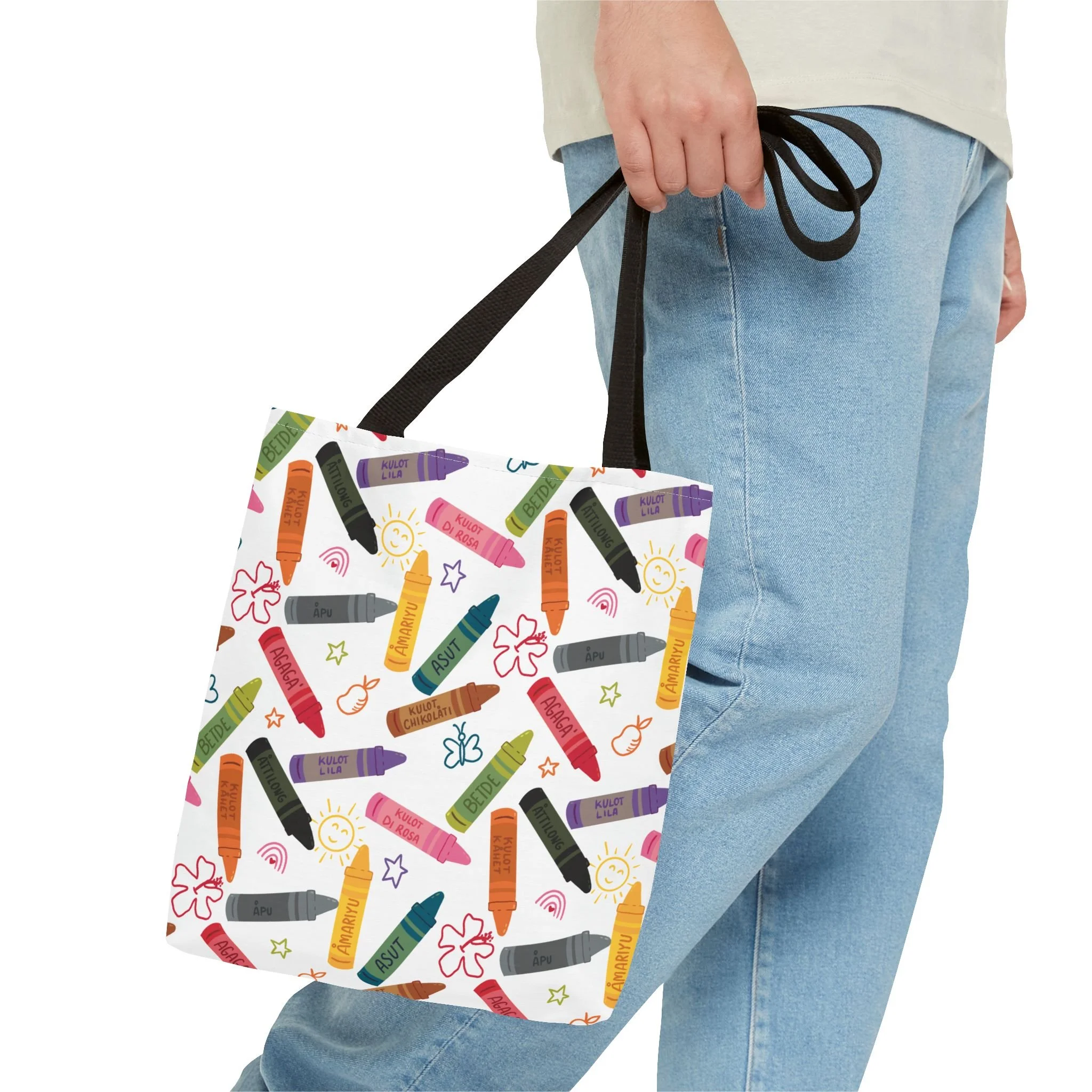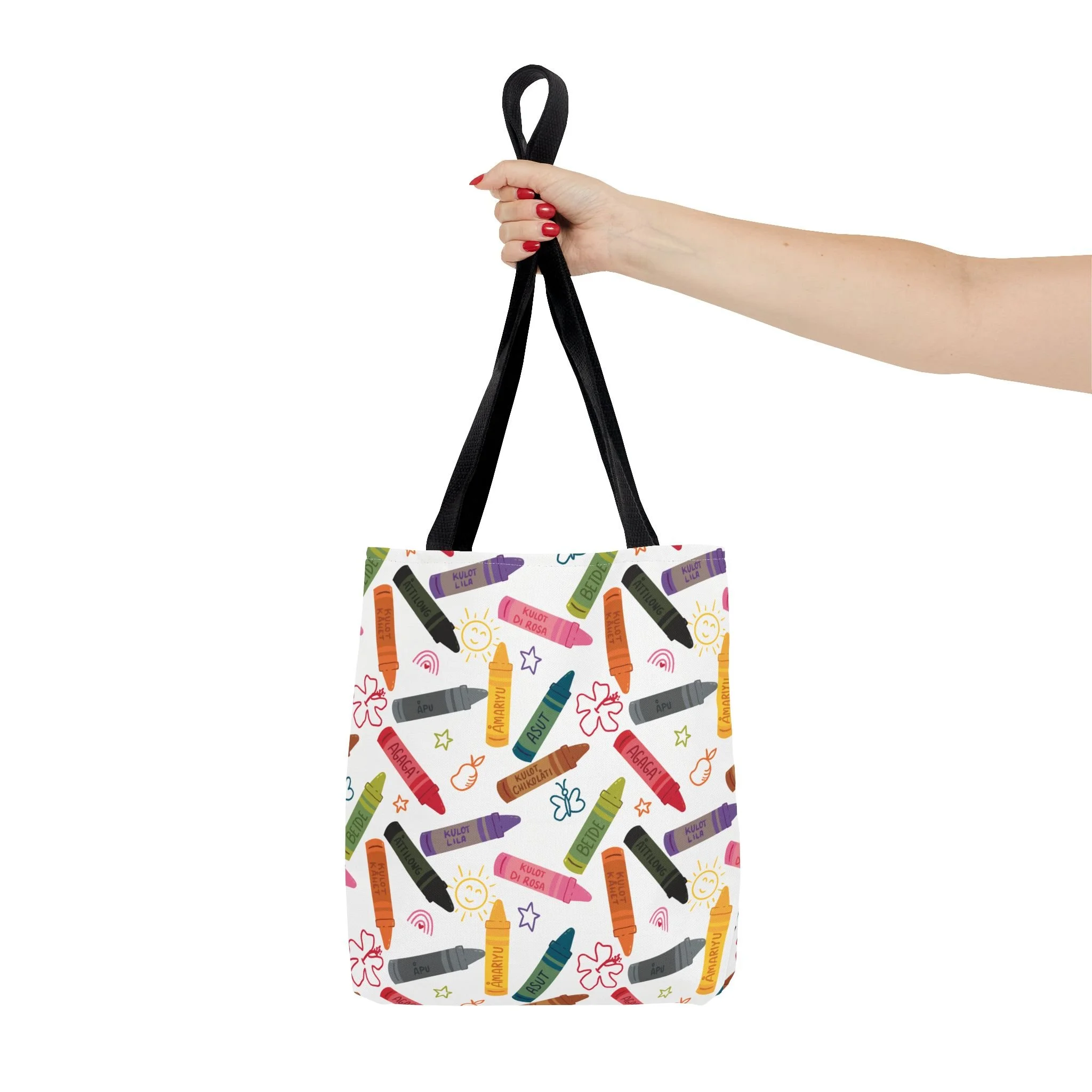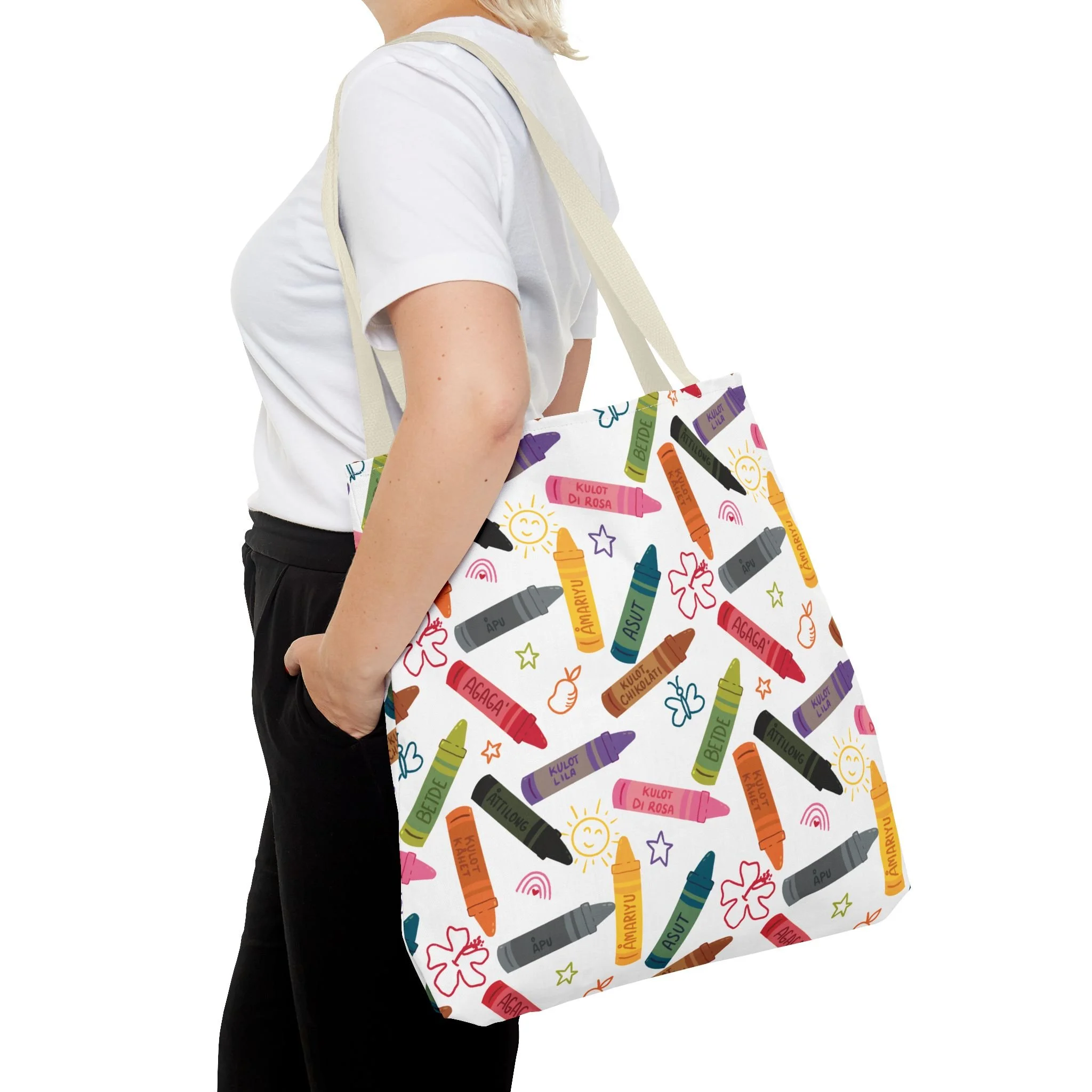 This vibrant Kulot Siha Chamoru color tote captures island pride and everyday utility in one durable bag. The colors and name celebrate Chamoru heritage while the roomy, boxed-corner shape carries groceries, market finds, beach towels, or a commuter’s essentials with ease. Reinforced handle stitching and a medium-weight polyester body stand up to daily use and quick drying after a day at the shore. Subtle, color-matched inner seams and a non-woven laminate interior give the tote a clean finish and structure without adding bulk. Choose from multiple handle colors and three sizes to suit market trips, classroom gear, or a relaxed weekend by the water—this tote keeps the feeling of place close at hand and makes daily errands feel a little more like coming home.